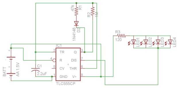 A continuación, verás un esquema de lo que tenemos hasta ahora. Se ve un poco diferente que el circuito en el enlace original, pero sobre todo es solo apariencias. La única diferencia real entre el circuito en http://www.satcure-focus.com/tutor/page11.htm y en este paso son el valor de la resistencia del resistor limitador de corriente, y el hecho de que ahora tenemos 4 LEDs en paralelo, en lugar de sólo un solo LED.