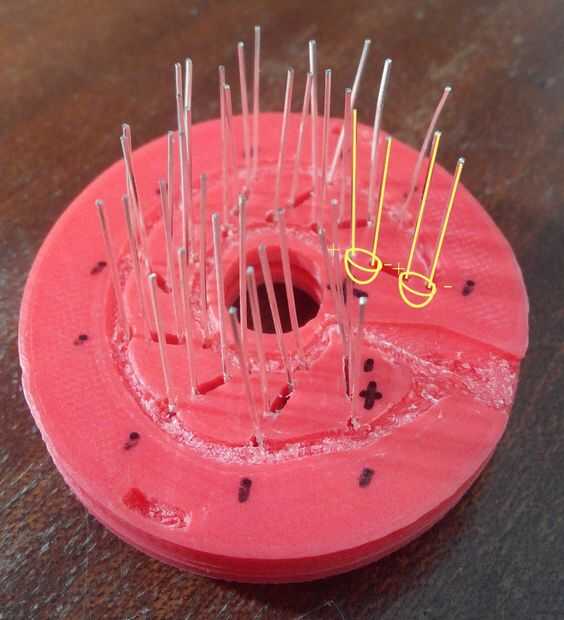 La parte del LED de la que salen los cables debe intercalada entre las dos impresiones.