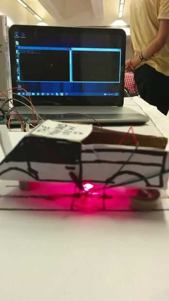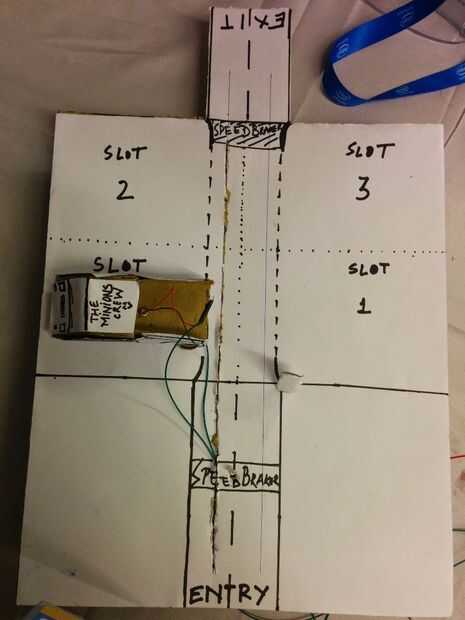 Utilizamos la cartulina para hacer una simulación de un estacionamiento y coloque el diodo de láser en la base del coche (hecho con cartulina.