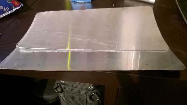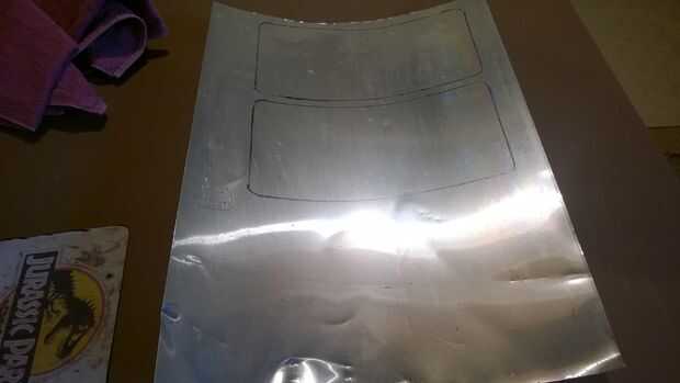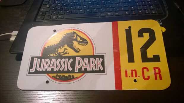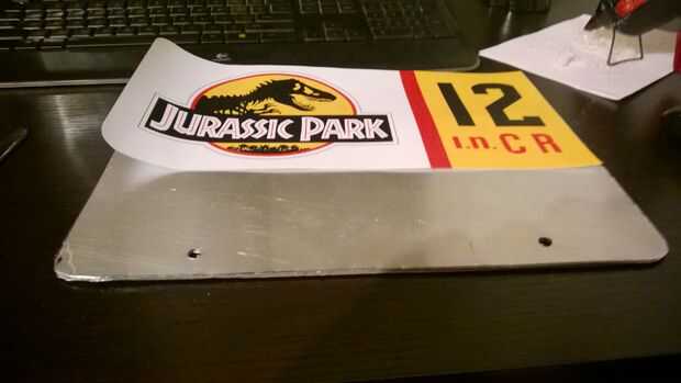 Quería que mi placa sea tan realista como sea posible. Tomé las hojas de aluminio y cortar según los cánones de una placa de licencia válida (6 '' x 12 ''). Hice 2 capas. Luego pegué las dos capas y taladré agujeros en los lugares correctos. Compré una hoja de etiquetas (11 '' x 17 '') e imprimí una placa modelo de Parque Jurásico. Aplicar la hoja de etiquetas en mi aluminio.