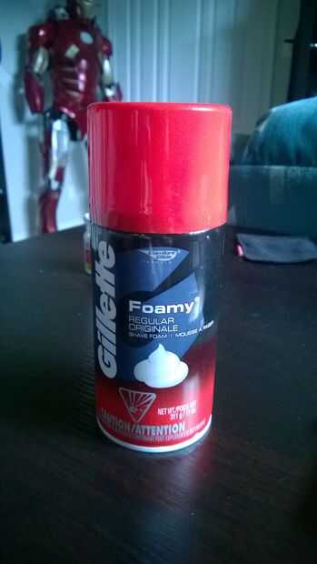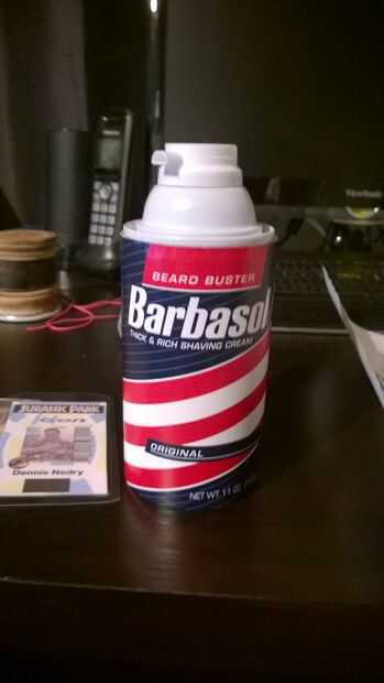 Uno de los pilares principales de Jurassic Park! Fue muy difícil encontrar que un Barbasol puede con este diseño. Después de mucho investigar, me detuve y me di cuenta de que podía hacerlo yo mismo para sólo 0$! Tomé un viejo puede (11 oz), vació lo que quedaba dentro y quité el diseño de papel/plástico. Usar un abrelatas, quité la parte inferior.
