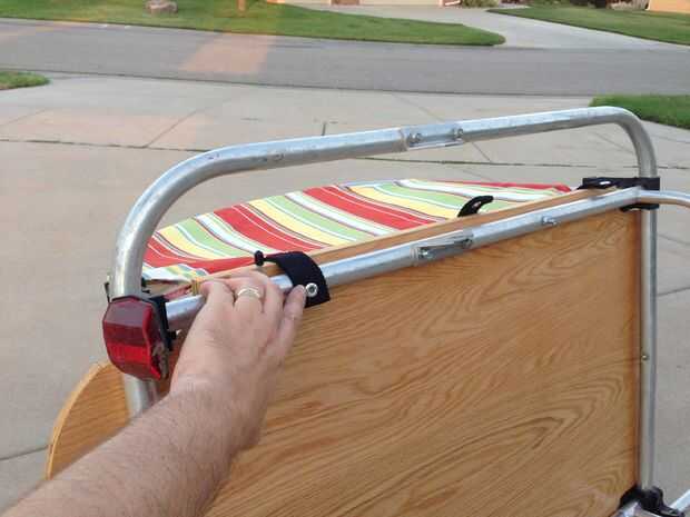 Deslice los paneles sobre los marcos, a continuación, vuelva a instalar los marcos hacia atrás en el remolque. En preferir el aspecto y la utilidad de los marcos de panel lateral cuando están instaladas al revés. Estire la tela, marcar el lugar donde las correas se fije a la parte inferior del marco, perfore pequeños agujeros para los tornillos, luego atornillar en su lugar. He usado los tornillos cortos, metal de hoja que fuera del remolque cuando me quité la cubierta.