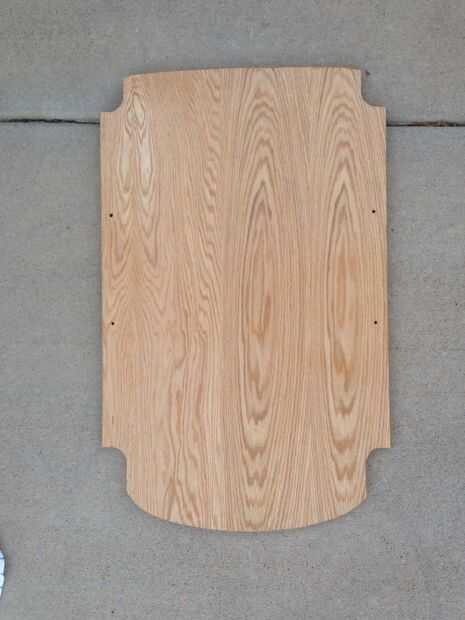 Medir la anchura de su remolque y la longitud. Trace un patrón ligeramente con un lápiz en la 3/4 madera contrachapada gruesa. Para darle una tabla de surf, look beachy, añadir algunas curvas y dejar el tablero colgar de la espalda. Trazado de las curvas que se muestra en la parte superior e inferior de la foto usando tapas de bolsas de plástico. En el diseño, tendrá que dejar espacio en las esquinas de los lados plegable fijar (como en la imagen). Usando una sierra mecánica para metales, cortar el tablero a medida.