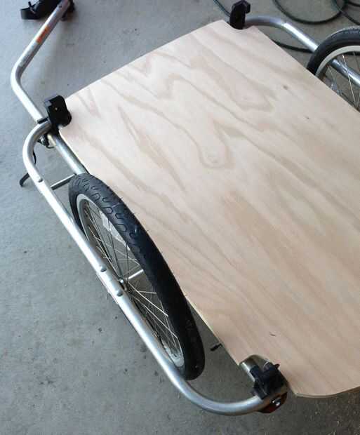 este simple remolque es ligero, barato y puede contener dos cubos de 5 galones, que contiene todo lo que te gusta. Se puede conectar a cualquier bicicleta normal y puede construirse con herramientas básicas. Una cuerda puede usarse en lugar de la mot