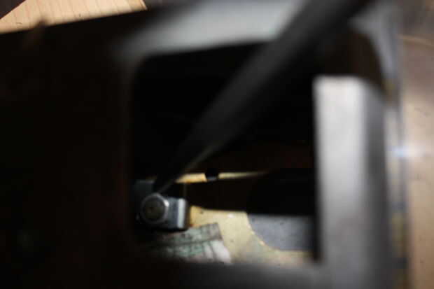 Mi primer paso es desactivar las cerraduras en el interior para que puedo abrir la parte superior en el resto de ella. su muy estrecha y hemos tenido éxito diferente con el uso de una toma de corriente con un adaptador de codo, pero lo que he encontrado funciona mejor es usar un cincel/destornillador contra una de las esquinas de la tuerca y golpeó la parte superior con un martillo. Esto debería ser suficiente para Destornillar lentamente pinchándola en la tuerca.