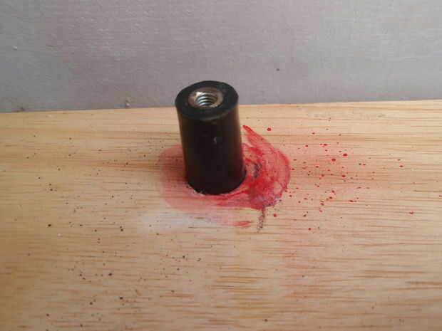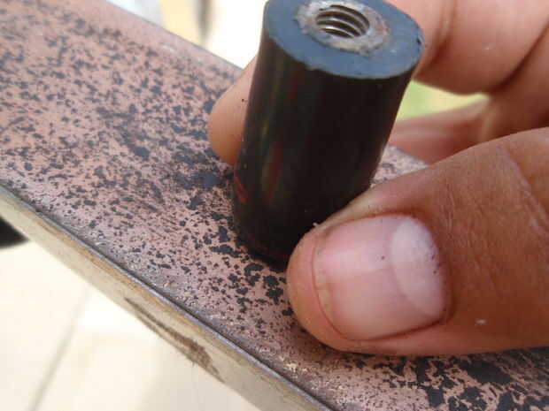 Archivo la parte superior de la toma de plano, por lo que encaja perfectamente en la bandeja. Utilice un poco de pegamento de madera y enchufe el conector. Coloque la bandeja en los agujeros de los brazos de parrilla en todos los puntos y el perno a la parrilla.
