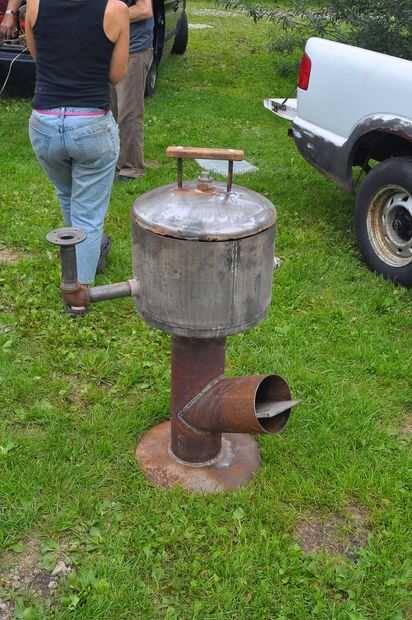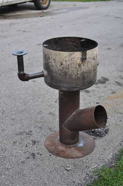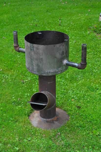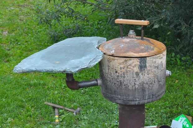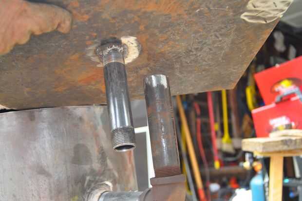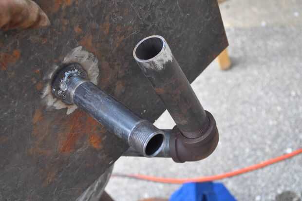 El tanque de presión de agua utilizado para hacer la parte superior de la parrilla, incluidas las conexiones de tubería en los lados. He comprado un par secciones cortas de tubería y codos para que éstos podrían apoyar las tablas laterales.