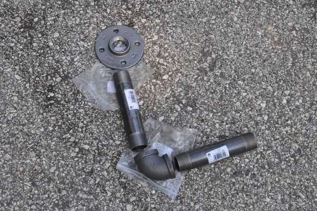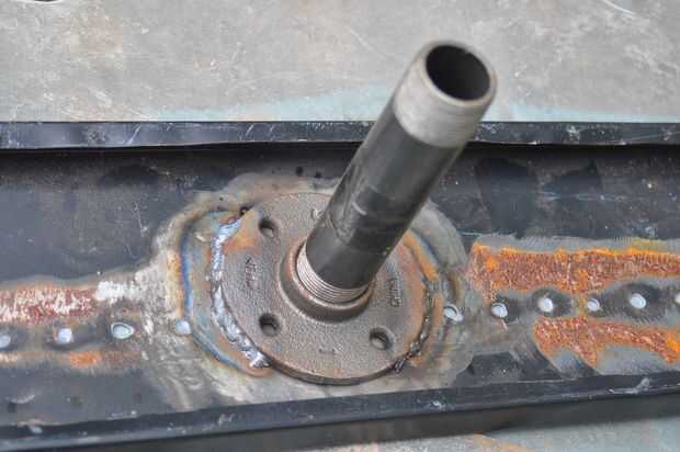 Para el acero a la derecha, sólo soldó con autógena el reborde de la pipa en la parte inferior de la misma rosca en la sección corta del tubo y se deslizó en el tubo vertical de diámetro ligeramente más grande. Un agujero perforado horizontalmente con un perno que se deslizó a través de él terminó ese lado.