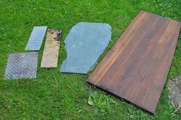 Al principio, estaba segura que quería utilizar para la superficie superior de las tablas laterales. He cavado mi montón de chatarra/recuperado/reciclado materiales y encontró una variedad de piedra, azulejos, acero, aluminio y madera.