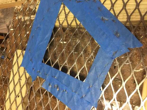 Una vez que la parrilla es cortada al mismo tamaño que el patrón - orificio para el pájaro pegar a través. Quería compensar el pájaro así que tendría un poco más la parrilla cuando llega temporada de maíz dulce. Asegúrese de que el agujero para el pájaro es suficientemente grande para su pájaro. Mi pájaro mide aproximadamente 7 pulgadas... Tenía un cucharón multiusos que fue alrededor de 9 pulgadas. Así solía el cucharón multiusos marca mi círculo.