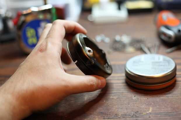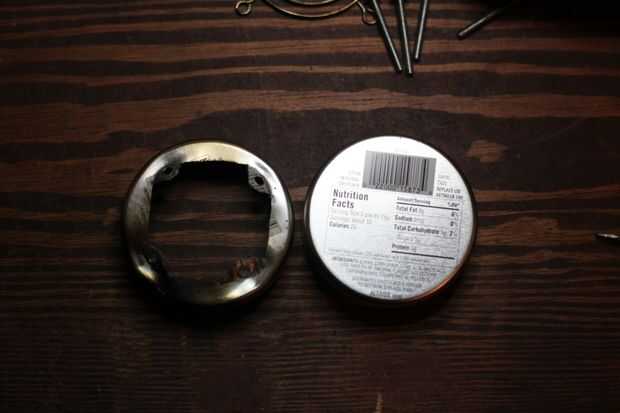Después de tener los agujeros use una herramienta Dremel y disco de corte para quitar el centro de la lata, dejando 2-3mm de metal alrededor de los orificios que sólo ha perforado. Retire suficiente metal para que las "fichas" con los 4 agujeros pueden doblar fácilmente hacia el exterior sin alterar la forma de la lata o de interrupción. Cuando el metal se quita doble las lengüetas de estos ligeramente (~ 15 grados)