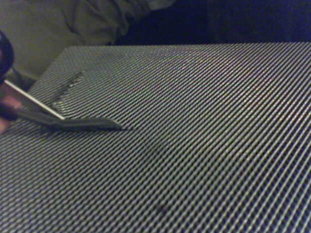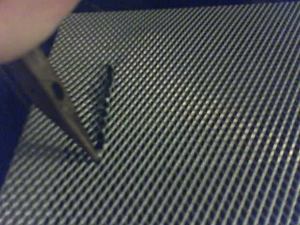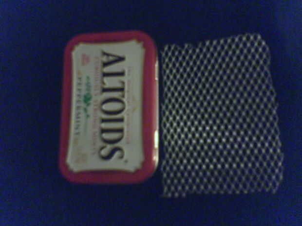 La malla se utilizará para la superficie de cocción y debe ser aproximadamente la mitad una pulgada más ancho que el Altoids lata por lo que puede estar doblado en.  Tenga cuidado al cortar porque los bordes pueden ser muy agudos.