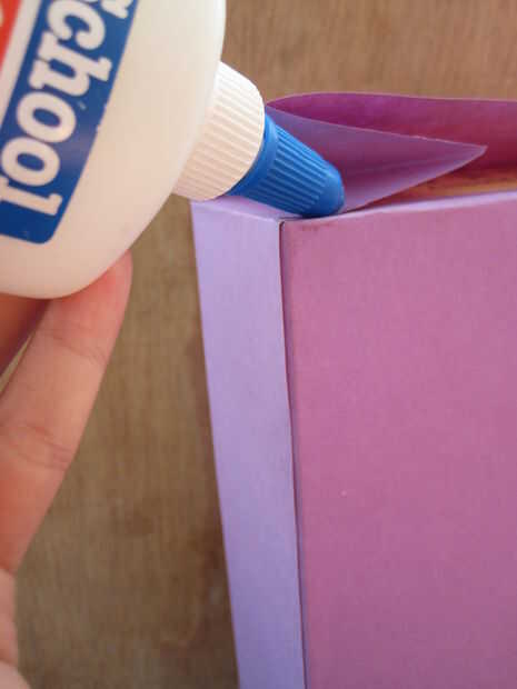 Cubrir la caja con papel de construcción con el color que desee. Pegar el papel a la tapa de la caja completamente.