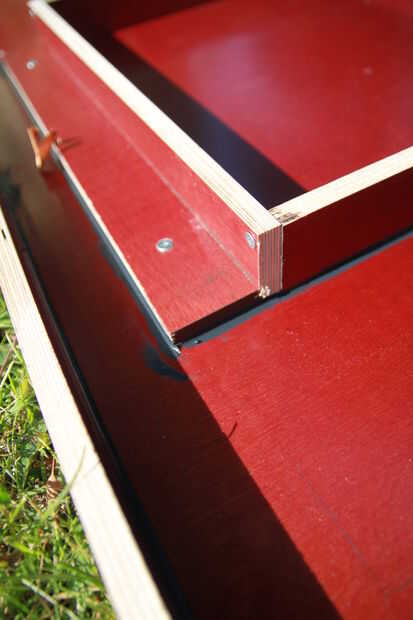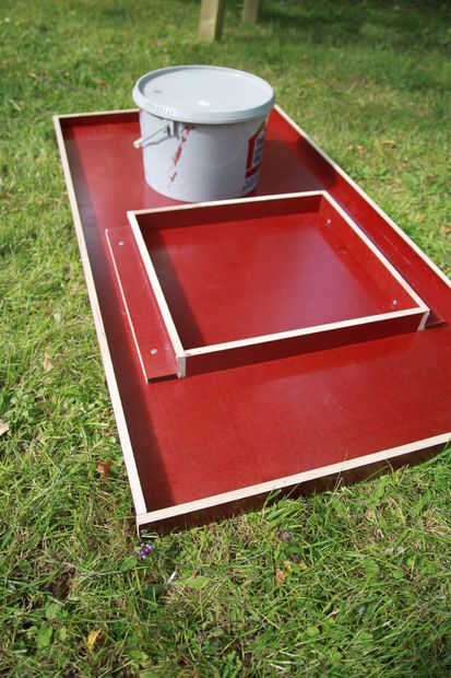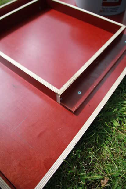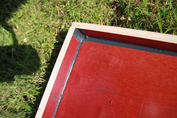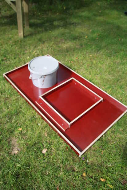 Fui a una cuadrícula y un agujero redondo para colocar en una sartén. La placa se cortó en una hoja base y varias astillas. Estas se colocan como el borde exterior por ser atornillado a la hoja grande. Para la Plaza una plaza fue atornillada y darle a la rejilla que se coloca sobre dos astillas se acostado, para darle un surco. Esto también fue atornillado sobre la hoja. Para el agujero redondo que una pintura vieja puede fue utilizado que fue colocada en el agujero que iba a ser.