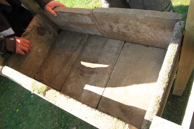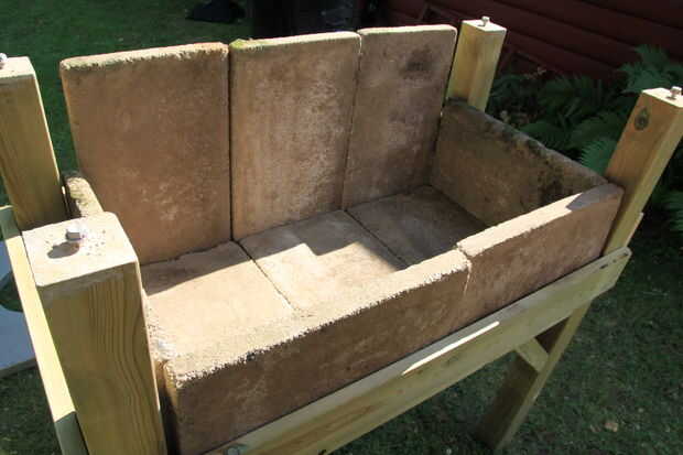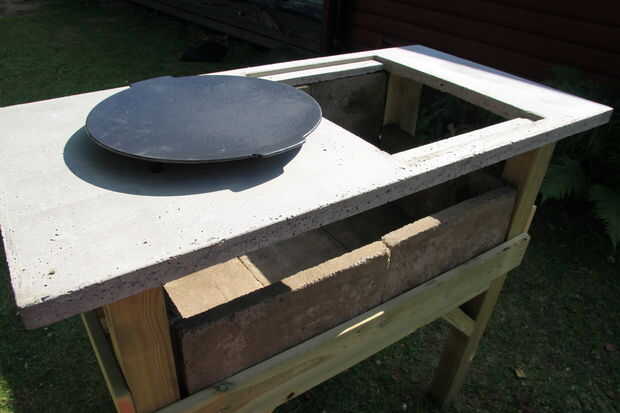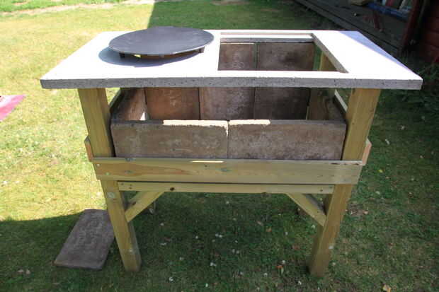 Ahora coloqué los bloques de hormigón en el soporte de madera para hacer una caja fuerte donde se colocaba el fuego. Realmente no había medido con precisión suficiente y no encajan como lo planeado. Esto requiere de algunos cortes de los bloques que no he tenido la oportunidad de. Sin embargo, la imagen muestra una colocación similar, la diferencia que no alcanzan hasta la pizarra superior y así no cubren el soporte de madera. Esto será rectificado con algunos cortes...