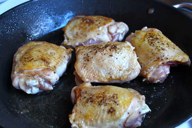 Caliente una sartén sobre fuego medio alto con un poquito de aceite en ella. Una vez que el aceite es brillante, colocado en el lado de piel de piezas de pollo. Deje que estos cocción durante un par de minutos hasta que la piel ha disminuido un poco y pasado un bonito color dorado. Voltear y cocinar del lado de la carne para un par de minutos.