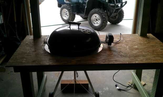 Una vez seco el marco, cortar una tapa para la mesa de tablero de partícula estándar. Dependiendo de su diseño, colocación del agujero se puede poner dondequiera que usted quiere. Coloqué mina más cerca al borde así tendría espacio para colocar alimentos, objetos, herramientas, etc.. Usé la tapa de mi parrilla para tener una idea de la forma que estaba buscando. Hice el agujero en forma de "U" lo suficientemente grande como para permitir que mi ahumador tambor, parrilla y asador para adaptarse.