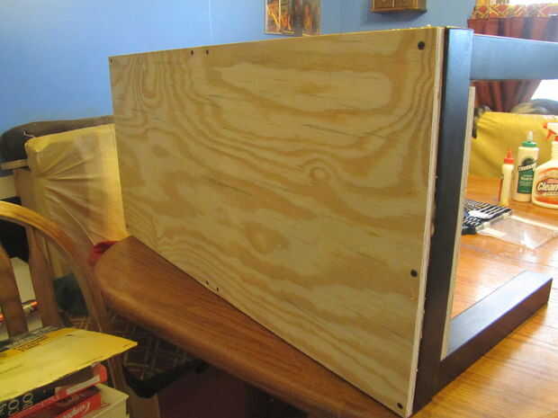 Decidí cortar un pedazo de madera contrachapada de 1/2 18 x 36 de la parte superior y luego una pieza que fue de 14 x 36 entre las piernas para ir debajo de las tapas. Intercala la parte superior entre las dos piezas de madera contrachapada de 1/2 pulgada, pegado en su lugar. Ya que no pude encontrar mis pinzas yo había volteada boca abajo las tablas y ladrillos en ellos. También he añadido algunos tornillos para asegurarse de que era seguro.