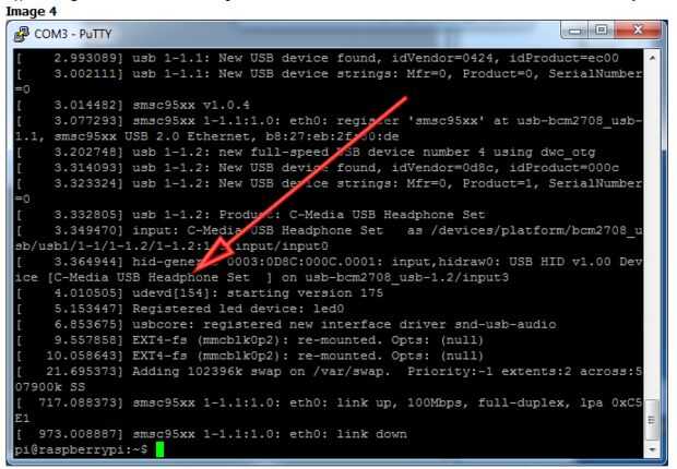 Escriba dmesg para ver los mensajes de arranque. Usted debe ver un montón de líneas que hablan de C-media USB Headphone Set