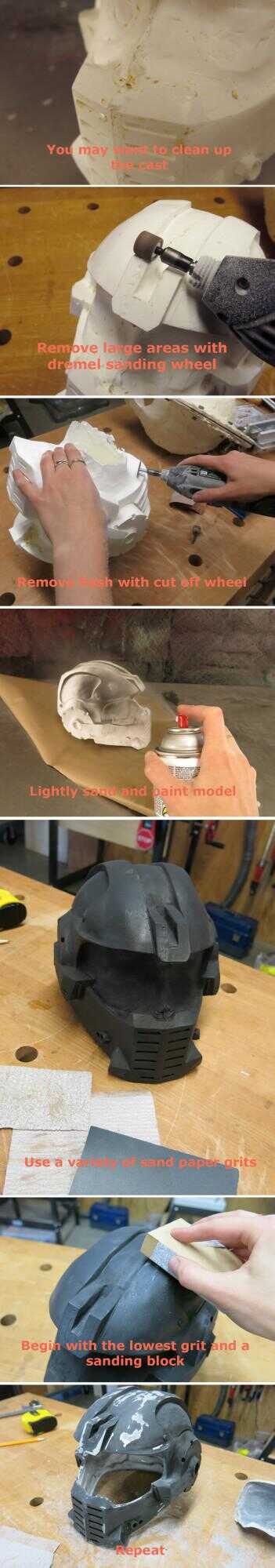 Utilizo una dremel rueda corte para eliminar grandes trozos de plástico y una rueda de lijar dremel para pulir piezas gruesas de plástico. Luego aplique una capa de imprimación y el modelo de la arena hasta que estoy satisfecho con el acabado. Alternativa lijado y aplicación de pintura. La pintura le permitirá ver la forma y determinar donde has lijado ya.