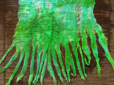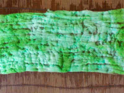 Llene la botella con agua caliente y agregue lentamente un poco de jabón. Cubrir parcialmente la botella con el dedo pulgar y espolvorear generosamente la bufanda entera. (También puede empujar los agujeros en la tapa de la botella). Coloque un pedazo de plástico de burbuja o de plástico encima de la mecha y con los pisos de las manos, empezar a trabajar el agua en la fibra. Agregar más agua según sea necesario. Desea la fibra al ser completamente saturadas con agua. Fibra seca no sentía!