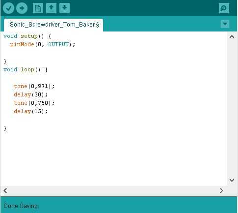 Sube el programa a la Attiny85. Puede utilizar Sonic_Screwdriver_Tom_Baker.ino para un sonido sonic más 4 de Doctor, o use Sonic_Screwdriver1.ino para el sonido más moderno.