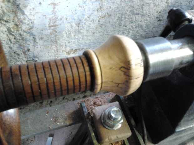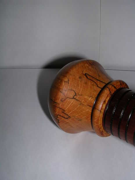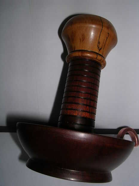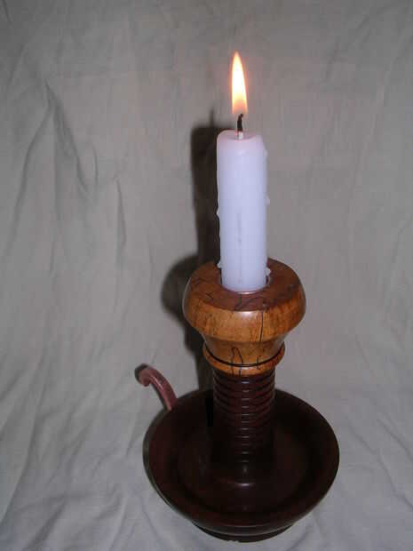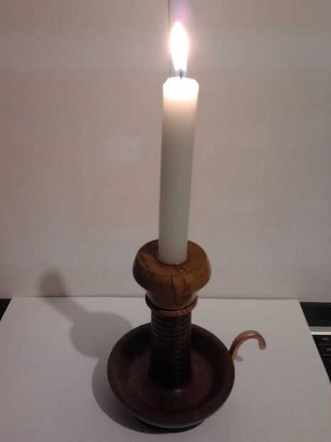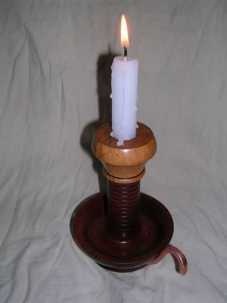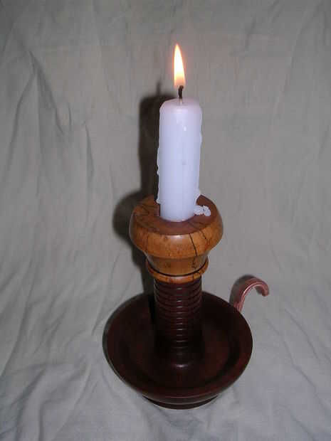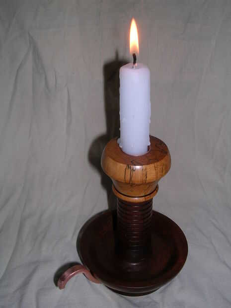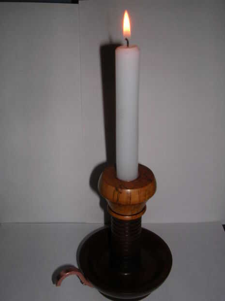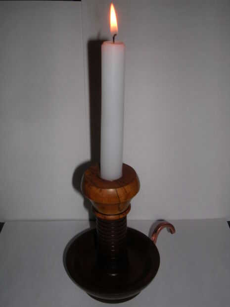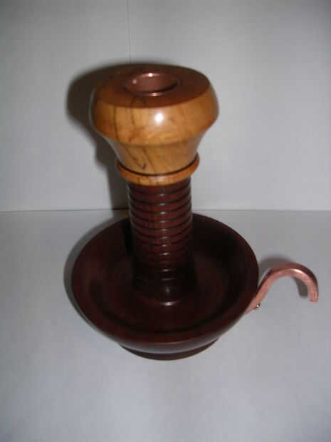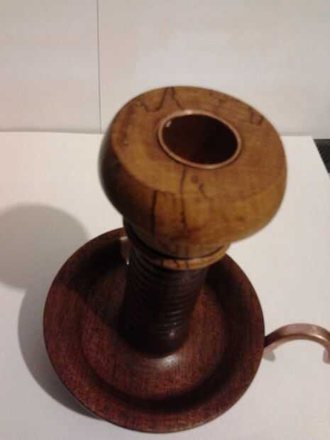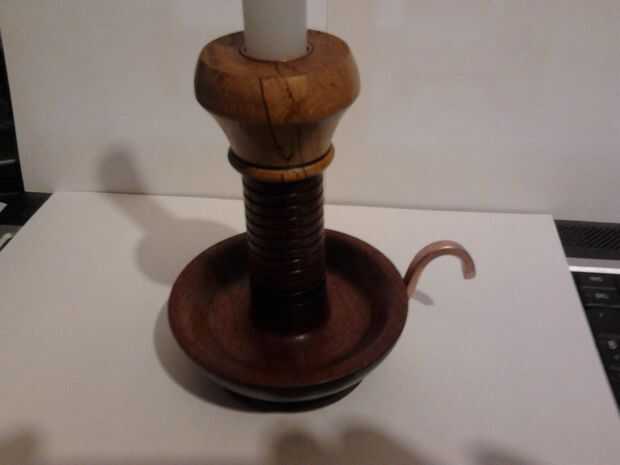 Todas las piezas donde pegado con pegamento de madera Titebond. Una vez que la conformación final se hizo la pieza fue enarenada con varios grados de papel de hasta grano 400 entonces las líneas decorativas donde pulido utilizando alambre de cobre. El palillo de la vela era entonces acabado con aceite de linaza hervido, Francés Polaco y finalmente dado una capa de cera de abejas sacar el brillo.