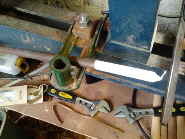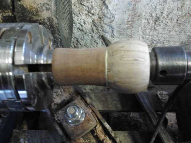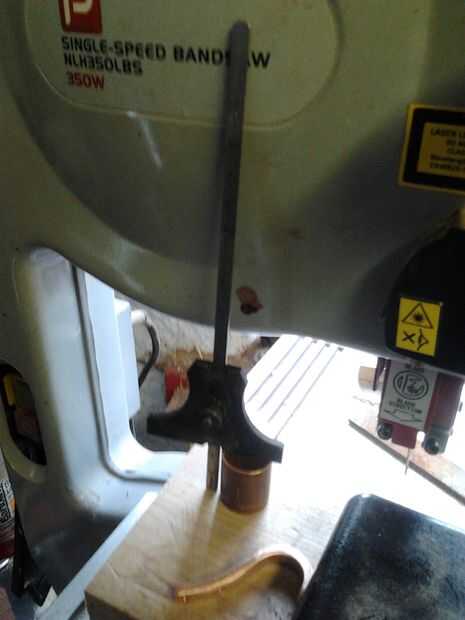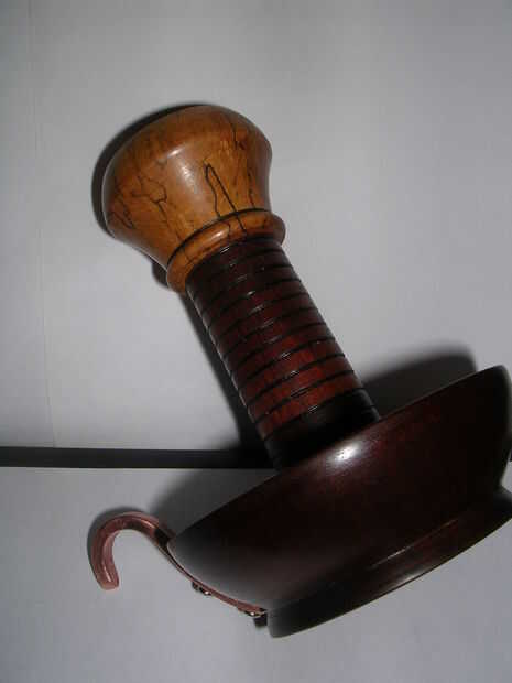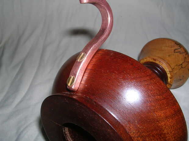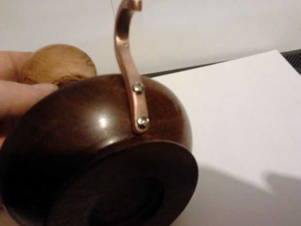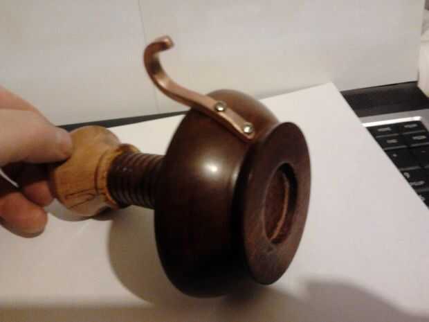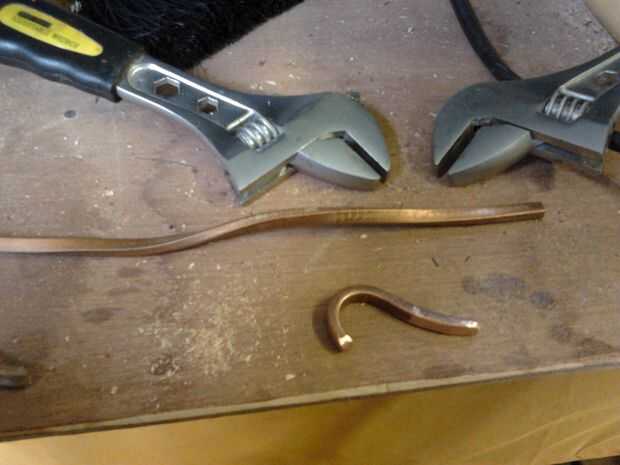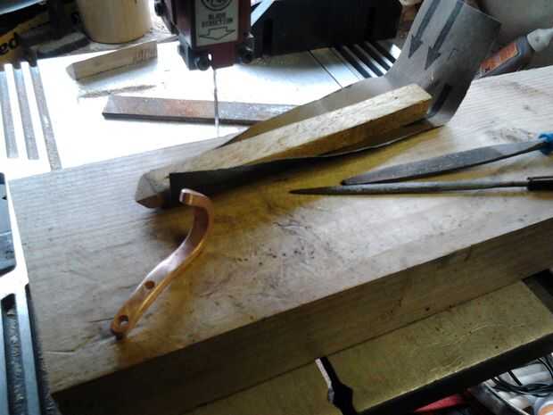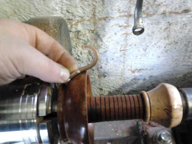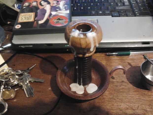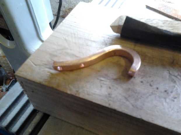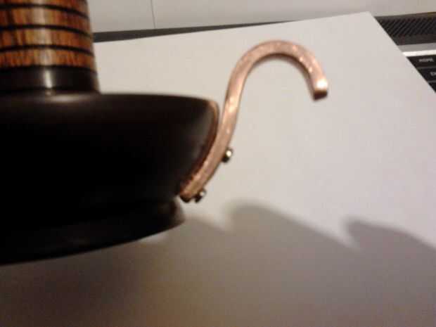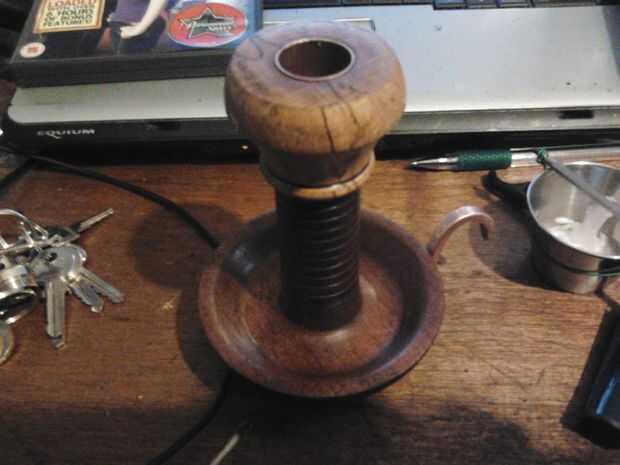 Fui a un diseño del llano como la playa tenía un efecto de grano agradable y sería el punto focal. El mango estaba hecho de un trozo de alambre de sección cuadrada gruesa cobre de la bobina de un transformador grande, doblado que forma usando 2 llaves ajustables. El mango fue perforado, presentado y lija para quitar cualquier marca de herramienta y darle un acabado liso y fue unido a la base del palo de vela con tornillo autorroscante pequeño reclama desde algunos equipos electrónicos una vez desmontado.