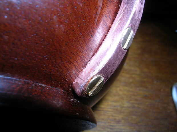 Los tornillos rescatados comenzaron a bug me y cayó en la ferretería local y compraron unos tornillos de cobre amarillo pequeña de sólo unos pocos peniques cada. Me contersunk la manija de modo que la cabeza del tornillo al ras con el mango. las cabezas del tornillo también tuvieron un ligero toque hacia arriba con el archivo de diamante para pulir de los bordes ásperos. El mango ahora se siente mucho más cómodo.