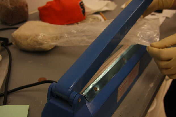 Selle las bolsas para mantener el micelio que contaminados y el batido de ellos hasta que el micelio se mezcla a lo largo de las bolsas. (tratar de evitar que el agar pegado a la parte superior de la bolsa)