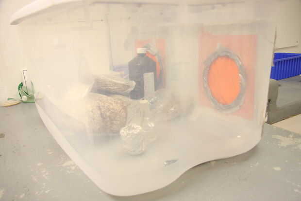 Lista de materiales: caja de guantes, bolsas de grano esterilizado, bisturí esterilizado, peróxido de hidrógeno, la lámpara de Gas o un encendedor, micelio en placas de Agar, Alcohol, guantes quirúrgicos, refrigerador, calentador de reptil, botella de lejía de sellador de bolsa.