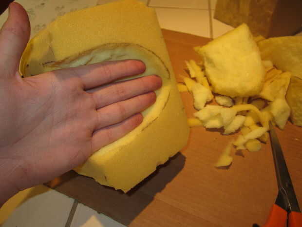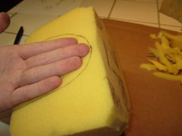 Si tiene dos piezas o acaba de terminar el paso anterior: así que tienes dos pedazos de espuma, en la forma vaga de una marioneta. Es hora de hacer espacio para la mano. Tomar la pieza superior (no la mandíbula) y traza tu mano en el centro de la parte inferior como se muestra en la foto 2. Se hueco este espacio trazado, por lo que hay espacio suficiente para su mano. Repita este paso para la mandíbula, excepto después de remontar el pulgar.