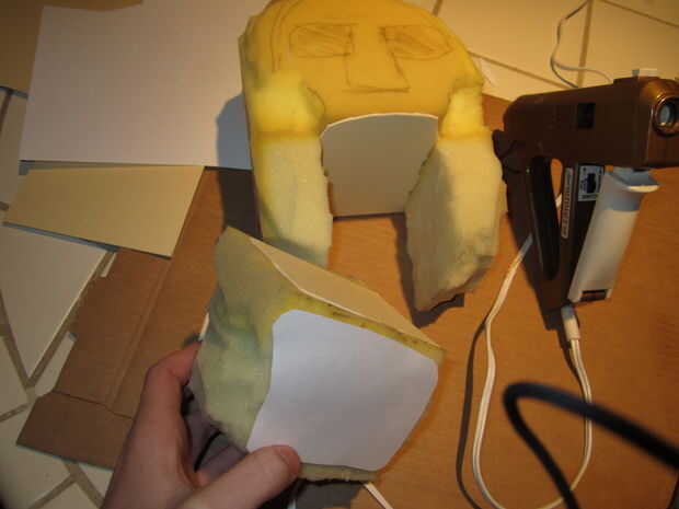 Ahora lo que tienes que hacer es incluir estos espacios. Usar una pistola de pegamento caliente, pegar algunos trozos de cartón sobre los agujeros (cortados las piezas del tablero de tarjeta ligeramente más grandes que el agujero sí mismo). Mirar hacia atrás en el cuadro uno. Tu títere debe buscar ahora, excluyendo solamente el papel del lado de la mandíbula.