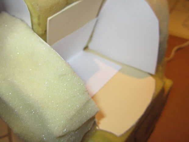 Ahora usted puede poner ese documento en la mandíbula! pegar piezas de cartulina (corte para caber o ser más pequeños que los lados de la mandíbula) en cada lado de la mandíbula. También lo mismo para el interior de la mandíbula (la mitad superior de la marioneta). Esto es para que la boca se mueve más fácil y más suave. Usted puede ahora cortar su último pedazo de papel para el día: lo hacen alrededor de 2 por 3 pulgadas. Doblar en la mitad del camino largo. Pegue en la mandíbula inferior como se muestra en la foto 3, luego en la parte superior de la cabeza como se muestra en la foto 4. Este documento funciona como una bisagra de la mandíbula. Deslice su mano en la parte posterior de su cabeza y darle una oportunidad antes de pasar al último paso de la primera parte.