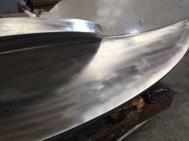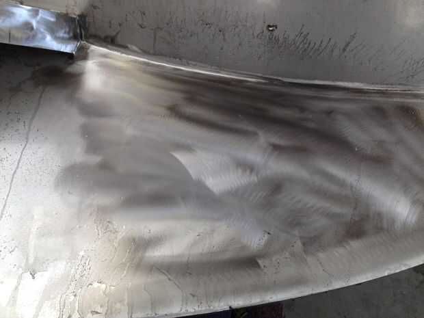 Las soldaduras de tapón, como se mencionó en el primer paso, eran un dolor enorme en el culo. El problema es que la soldadura de enchufe desvía el metal creando un hoyuelo que necesita ser tierra plana. Por lo tanto, decir despeinarte 2B agradable acabado con un 120 grano 7" disco de fibra, flotado sobre una gran superficie para mezclar en el hoyuelo. Buenos tiempos. A partir de ahí, trabajé el área usando abrasivos progresivamente más finos hasta que fui capaz de usar una herramienta de orbital aleatorio de 6" en toda la pieza.