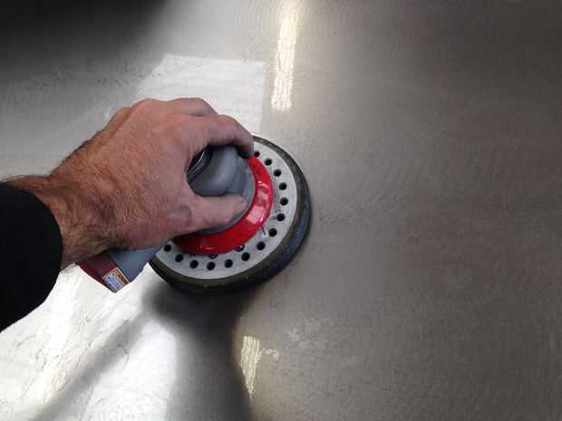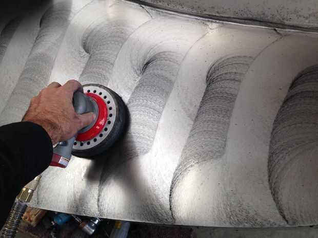 El objetivo ahora es terminar la superficie de un grano 240 superficie no direccional. Empecé con un disco de 6" y 120 grano y trabajó hasta en incrementos hasta una plataforma brillante muy fina Scotch. Los pasos del DA fueron las siguientes: 120, 150, 180, 220, 240, VF Scotch Brite. Puedes ver las superficies acabadas y sin acabar al lado del otro en la última foto.