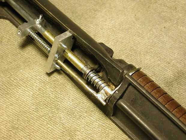 El punto de toda esta complejidad es por lo que el muelle funciona... todo de barril en vuelta puede ser empujado hacia atrás... pero la presión hacia atrás sobre el guardamanos de madera (tomado de una escopeta Winchester modelo 93) empuja a la parte de la cara de la Asamblea de presentación de nalgas en el bloque de recámara y permite los barriles a girar para volver a cargar.
