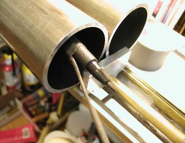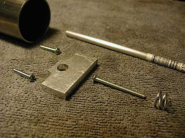 La pieza principal es un trozo de bolsa de aluminio. Está rebajado a montar a lo largo de dos rieles de latón en el interior del receptor, y es taladrada por un tubo de latón que se desliza libremente a lo largo de la varilla de amortiguación; manteniéndola alineada pero permitiendo el cerrojo abrir. Dos pernos de palillo a través en una dirección a capturar los barriles y un resorte y varilla mantiene alineada con el resto del bloque del cerrojo cuando el conjunto se empuja hacia atrás en el muelle.