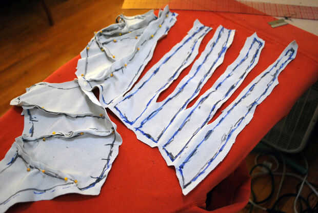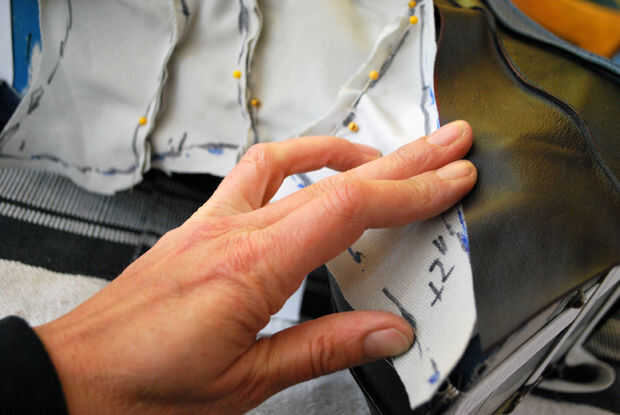 Las piezas de cuero para el frente izquierdo de Kali estaban todavía en el maniquí cuando empecé a trabajar en su lado derecho. Me sacó de las restantes piezas del patrón para su parte delantera derecha y comprobar sobre la forma. Las piezas se miraban bien, pero realmente no podía decir cómo lisa sería el ajuste. Ya que planea volver a colocar la piel muchas veces sobre, no era un problema. Yo hacia las piezas del patrón la tabla les liberar y volver a marcar mis líneas.