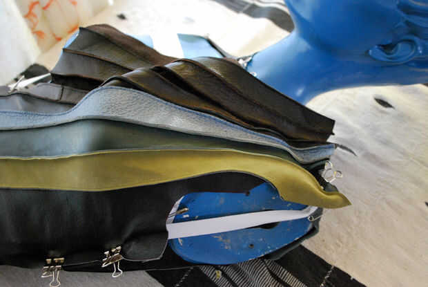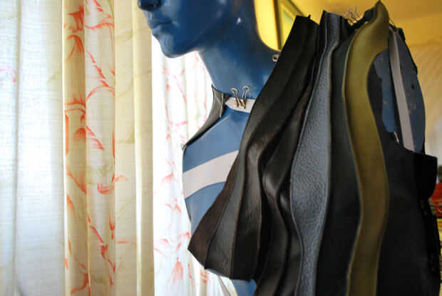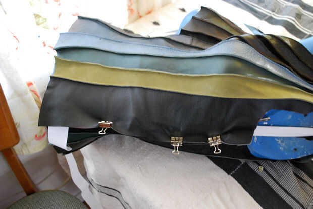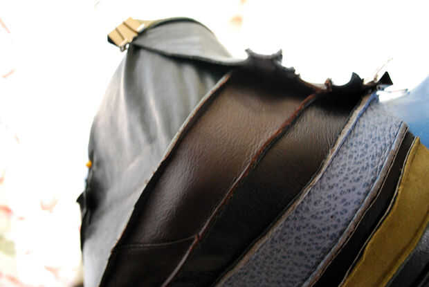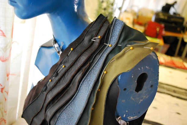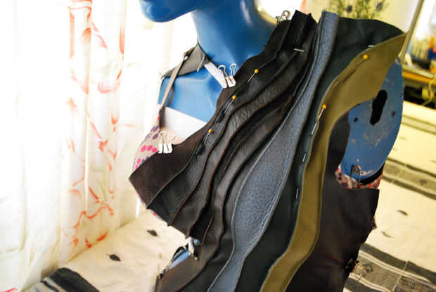 Hice otra prueba de montaje de la piel sobre la forma. El ajuste estaba bien en la cintura y la cadera, pero el área del busto fue demasiado flojo. Más pins al rescate! Ayudó levantar el cuero en el hombro y la fijación en el medio pecho y la axila. Todavía parece un poco flojo, aunque.