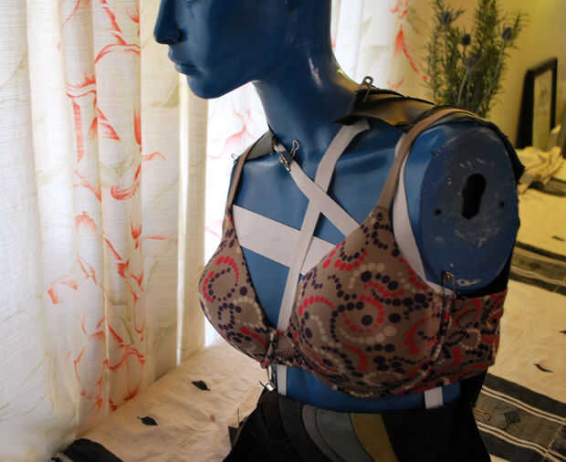 Liberará el hombro y me salió un viejo sujetador rellenado que recogí en un intercambio de ropa. Tenía una desagradable punteado de naranja, púrpura y crema sobre un fondo bronceado, pero la forma era buena. Ahora pude poner que utilice! Puse el sujetador sobre el maniquí, agregar algunos cojines de busto había sobrado de un trabajo de diseño de vestuario y cubrió a la costura del hombro de nuevo juntos.