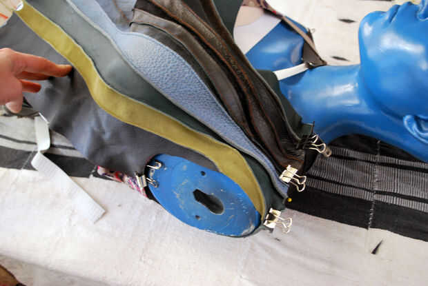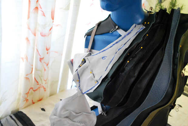 Una vez fue todo cubrió, quitó los clips de la carpeta y volver a coser todas las costuras fijadas. Recortado mi los márgenes hasta un escaso 1/8", alisar las costuras con mis dedos y nos dispusimos a ajuste de prueba una vez más.