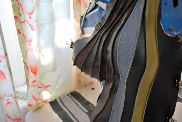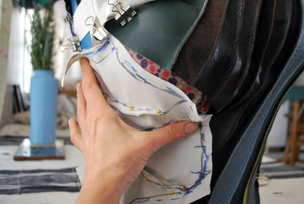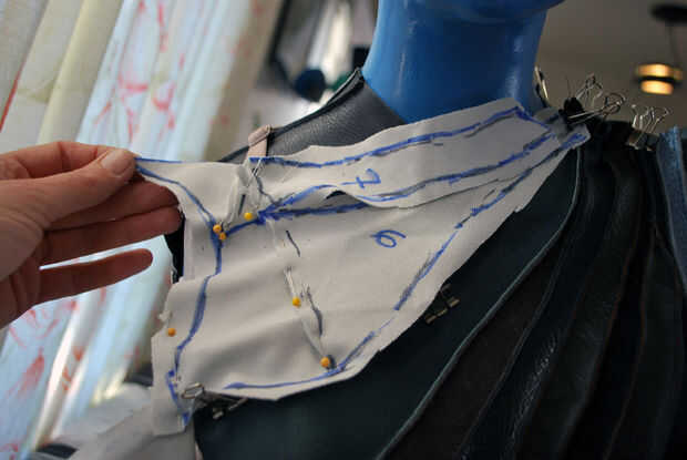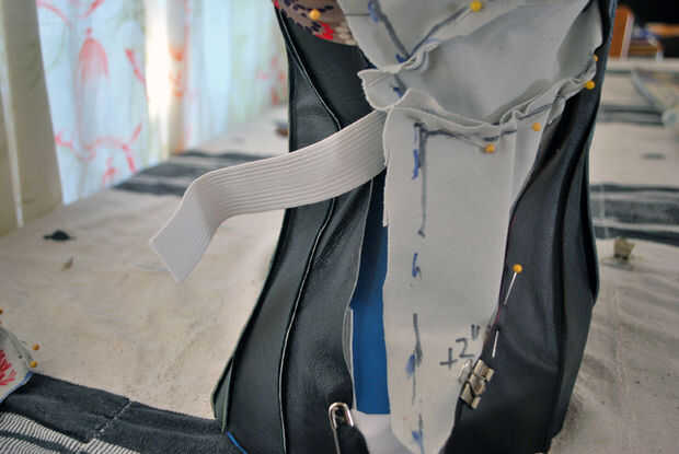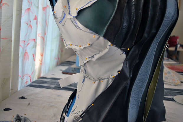 A continuación tuve el lado y la cadera patrones al cuero para ver cómo encajan. Era un poco torpe, así que cubrió las piezas del patrón al cuero. He podido prender todas las piezas en su lugar. Las viejas líneas de costura no funcionaba más, pero eso no fue un problema.