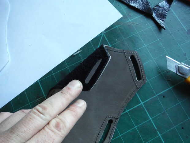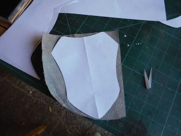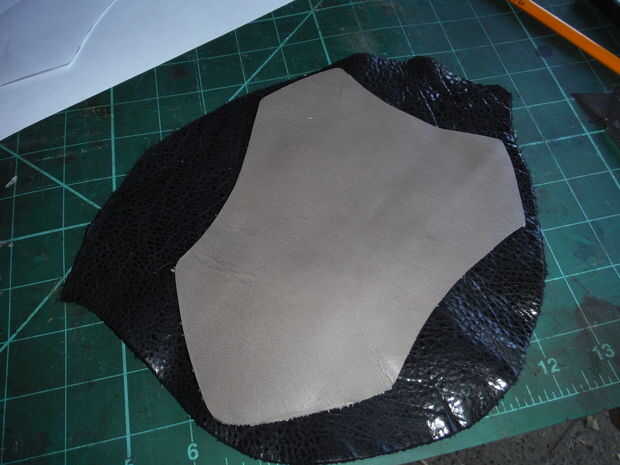 Para empezar, usted necesita cortar la forma de 'escudo' de su piel de verduras curtidas, luego pegar a la pieza curtido de cromo. Si la superficie de su piel de cromo es suave, como es la mía, usted necesitará áspero para arriba un poco con papel de lija para obtener buena adherencia.