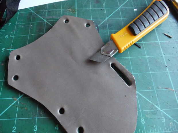 A continuación, perfore agujeros las ranuras para las correas de la marca y luego, utilizando una regla y un cuchillo, cortar el material entre los agujeros.