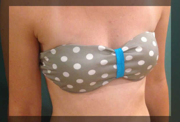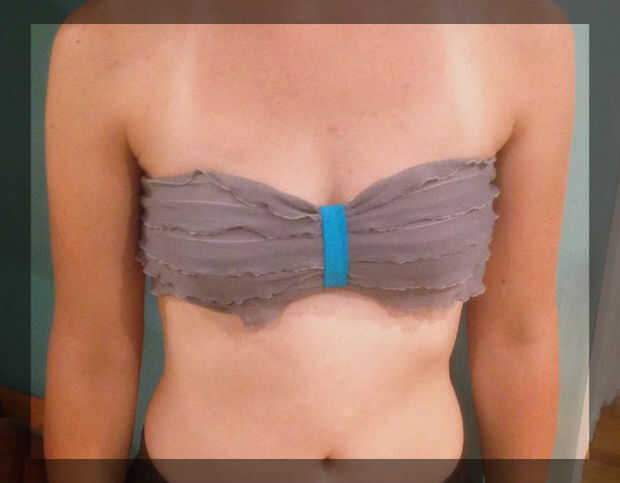 Este bikini bandeau auto alineado es super sencillo de hacer. Se hace solamente de 4 rectángulos y no utiliza a mucho la tela. Era capaz de hacer con 1/4 del medidor de cada color. Este bandeau fácilmente podría costar menos de $10, o incluso gratis,