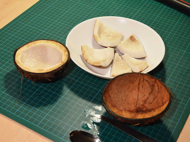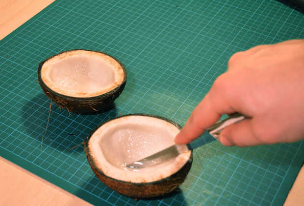 Cortar y quitar la parte comestible (blanco) del coco con un cuchillo.