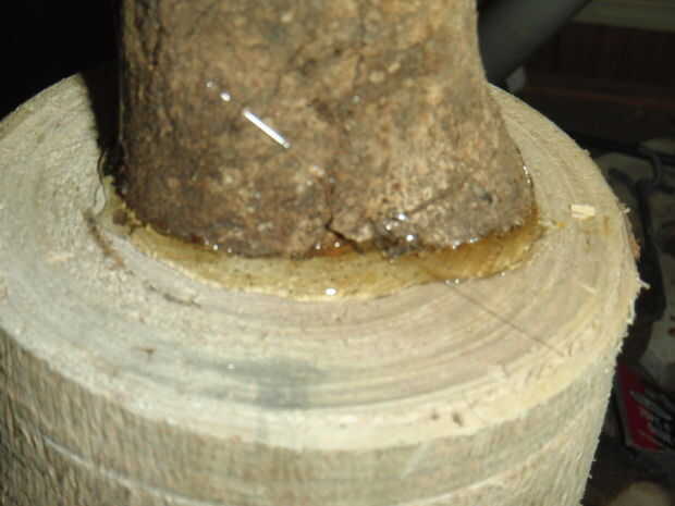 Ahora sólo poner una gota grande de hotglue en la parte inferior de la pieza y pegar en la madera. Y luego ir alrededor borde rellenando los huecos.