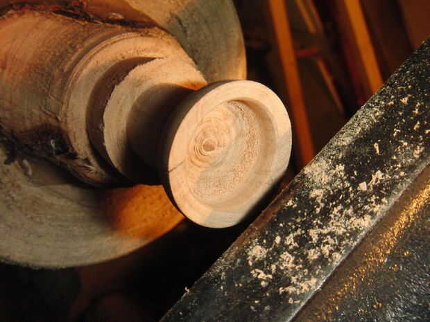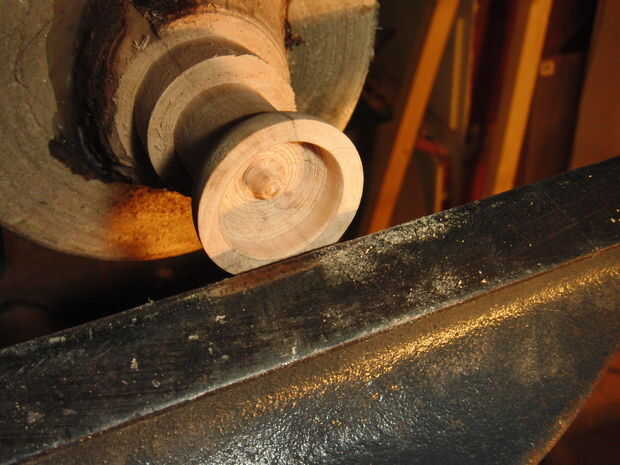 La idea de este paso es el más bajo centro de gravedad por debajo del punto de equilibrio. Para ello hacemos un anillo bastante grueso en la parte inferior de la parte superior y delgada el resto del cuerpo. Las herramientas que utiliza para esto fue un pequeño sesgo y una gubia de detalle. Mientras que forma el cuerpo Asegúrese de que dejar un cilindro de 1/4" en el centro que puede formar la punta de más adelante.