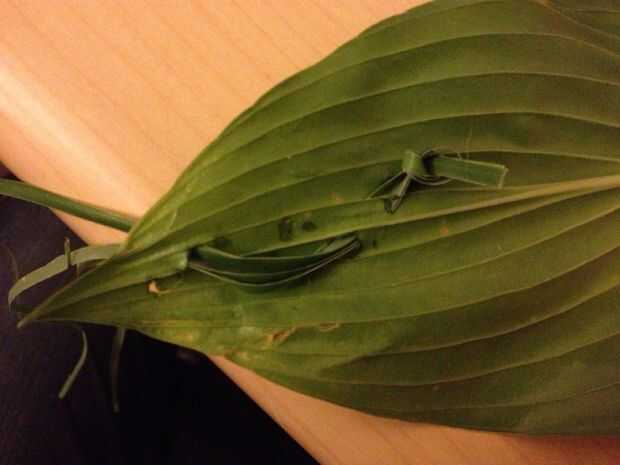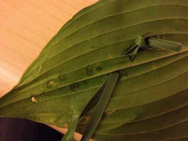 Había roscada la "cadena" en el orificio más lejano hasta el nudo. Tuve que hilo lentamente para evitar rasgar la hoja. Trabajé la rosca hacia la parte externa de la hoja.